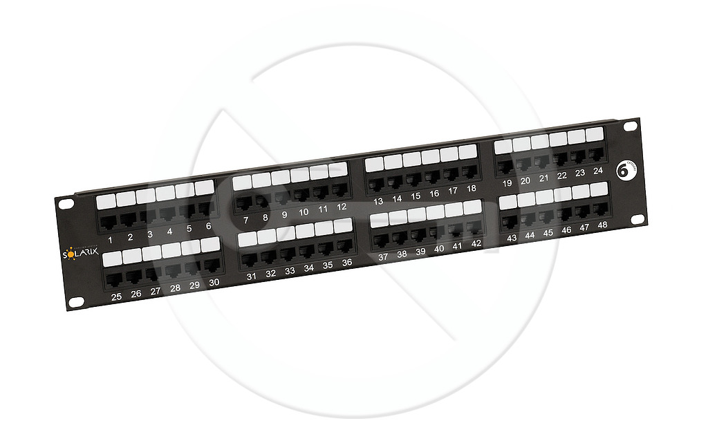 Nestíněný patch panel s označením SX48-6-UTP-BK je vysoce kvalitní panel kategorie 6, který je testován pro šířku pásma až do 350 MHz, čímž převyšuje požadavky na komponenty definované ve standardech ANSI/TIA 568, ISO/IEC 11801 a EN 50173 pro kategorii 6 a třídu vedení Class E, včetně všech nejnovějších dodatků. Panel je dodáván 48 porty RJ45 a je osazen moduly s duální IDC svorkovnicí 110/Krone. Kontakty jsou na svorkovnici z důvodu snadného zakončení datového kabelu označeny barvami podle typu zapojení, a to buď podle standardu T568A, nebo T568B. Panel SX48-6-UTP-BK patří do skupiny komponentů systému Solarix - kategorie 6 a stejně jako všechny komponenty v této produktové řadě jsou vyrobeny tak, aby poskytovaly maximální životnost, vynikající výkon, spolehlivost a především jednoduchou instalaci. Barva tohoto patch panelu Solarix kategorie 6 je černá, velikost 2U.
