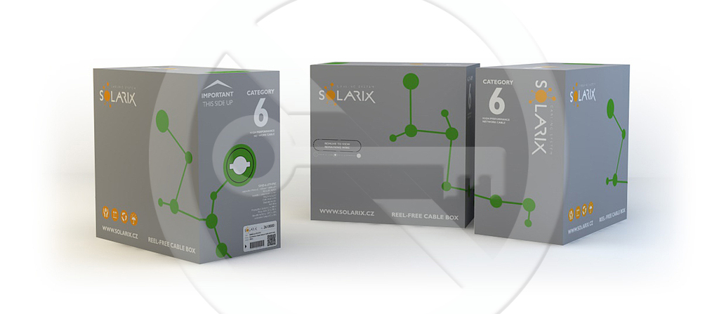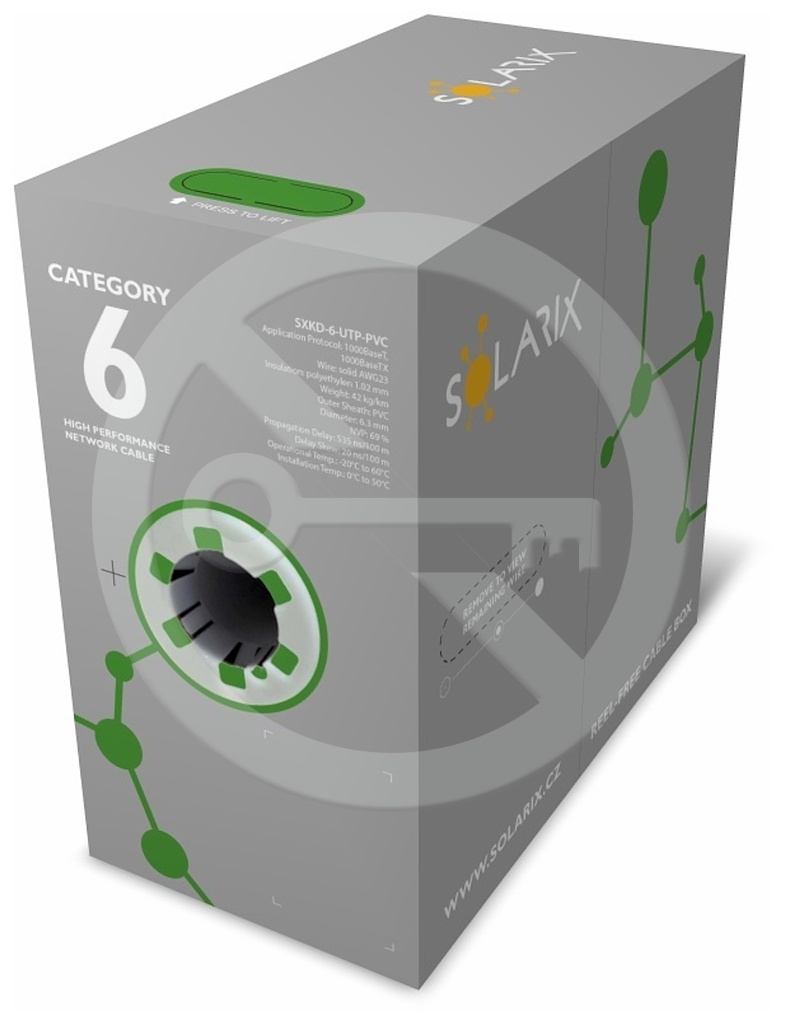 Instalační kabel Solarix s označením SXKD-6-UTP-PVC je spolehlivý nestíněný kabel kategorie 6, který je určený pro provoz ethernetových protokolů, včetně 2.5GBASE-T a 5GBASE-T. Konstrukce kabelu je U/UTP s plastovým křížem, který zajišťuje maximální oddělení párů od sebe po celé délce kabelu. Typ pláště je PVC s třídou reakce na oheň Eca. Vodiče kabelu jsou vyrobeny z kvalitního měděného drátu s čistotou mědi 99,97%. Kabel bez problémů splňuje požadavky z mezinárodních standardů ISO/IEC 11801, EN 50173 a ANSI/TIA 568.2-D. V případě CPR (nařízení EU č. 305/2011) je kabel testován u nezávislé laboratoře FORCE TECHNOLOGY v systému posuzování vlastností AVCP 3. Stejně jako ostatní kabely Solarix, je i kabel SXKD-6-UTP-PVC značen metráží po 1 m v rozsahu od 0 do 305 m. Kabel je dodáván ve vysoce odolném třívrstvém leštěném kartónovém boxu, na kterém jsou uvedeny všechny nezbytné produktové informace, včetně čárových kódů, výrobní šarže, popisu a nejdůležitějších technických parametrů.