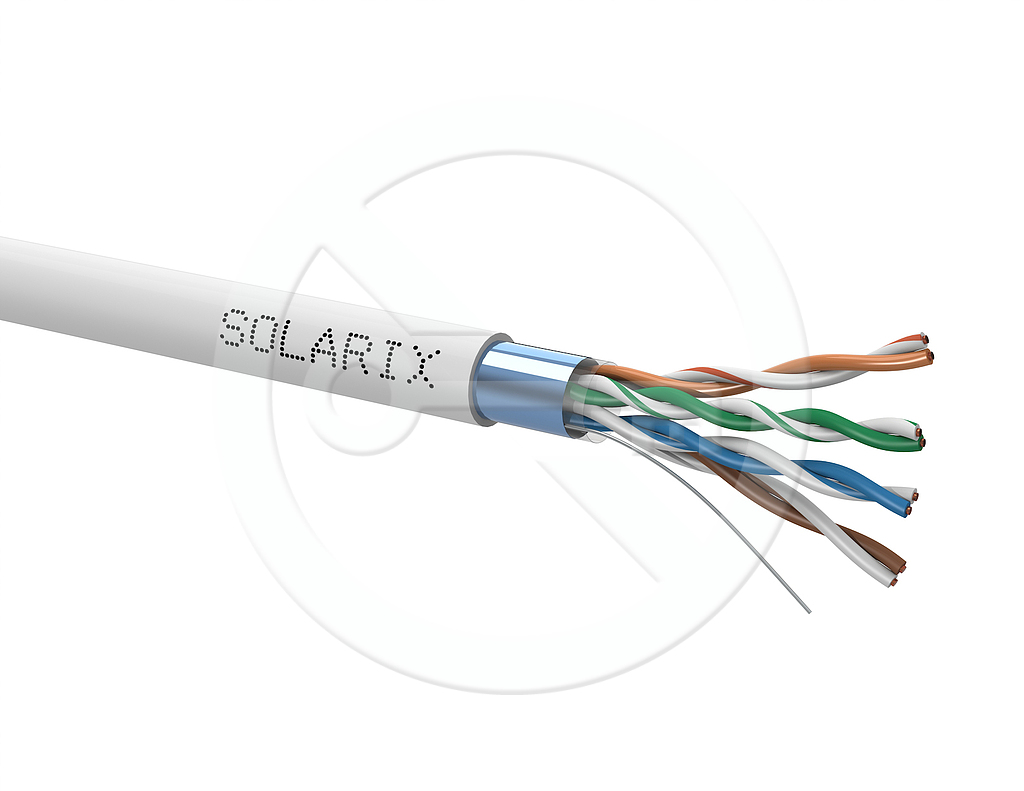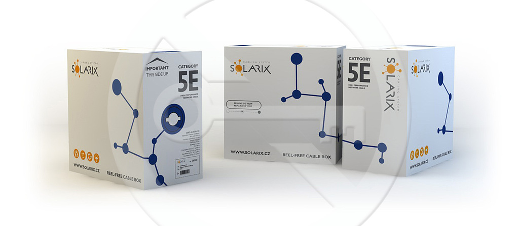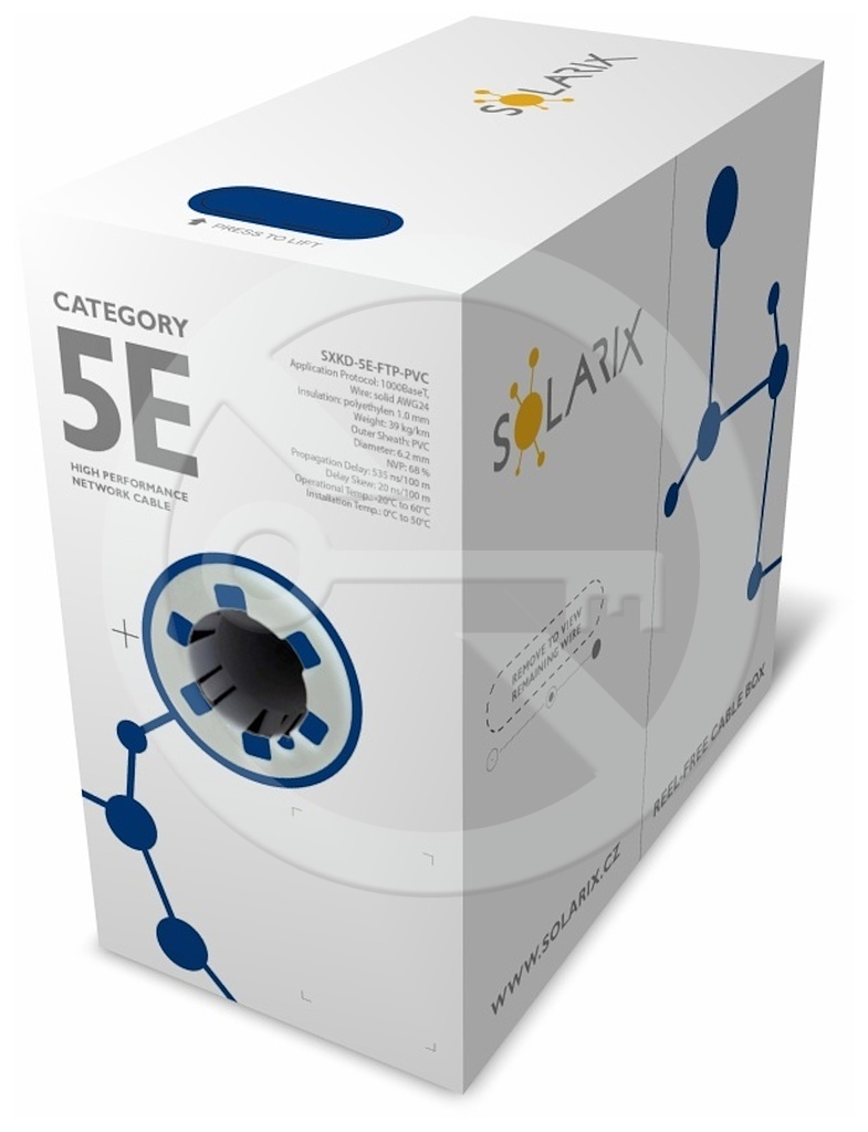Instalační kabel Solarix s označením SXKD-5E-FTP-PVC je spolehlivý stíněný kabel kategorie 5E, který je určený pro provoz ethernetových protokolů, včetně 2.5GBASE-T a 5GBASE-T*. Konstrukce kabelu je F/UTP, typ pláště PVC s třídou reakce na oheň Eca. Vodiče kabelu jsou vyrobeny z kvalitního měděného drátu s čistotou mědi 99,97%. Kabel bez problémů splňuje požadavky z mezinárodních standardů ISO/IEC 11801, EN 50173 a ANSI/TIA 568.2-D. Výkonové parametry tohoto kabelu byly otestovány nezávislou testovací zkušebnou FORCE TECHNOLOGY v rámci programu EC Verified, a to na nejvyšší úroveň tzv. Component Level. Certifikát je k dispozici zde na webu v záložce "Soubory ke stažení" nebo přímo na stránkách laboratoře FORCE. V případě CPR (nařízení EU č. 305/2011) je kabel testován u nezávislé laboratoře FORCE TECHNOLOGY v systému posuzování vlastností AVCP 3. Stejně jako ostatní kabely Solarix, je i kabel SXKD-5E-FTP-PVC značen metráží po 1 m v rozsahu od 0 do 305 m. Kabel je dodáván ve vysoce odolném třívrstvém leštěném kartónovém boxu (vždy barevně odlišeném podle typu kabelu), na kterém jsou uvedeny všechny nezbytné produktové informace, včetně čárových kódů, výrobní šarže, popisu a nejdůležitějších technických parametrů.