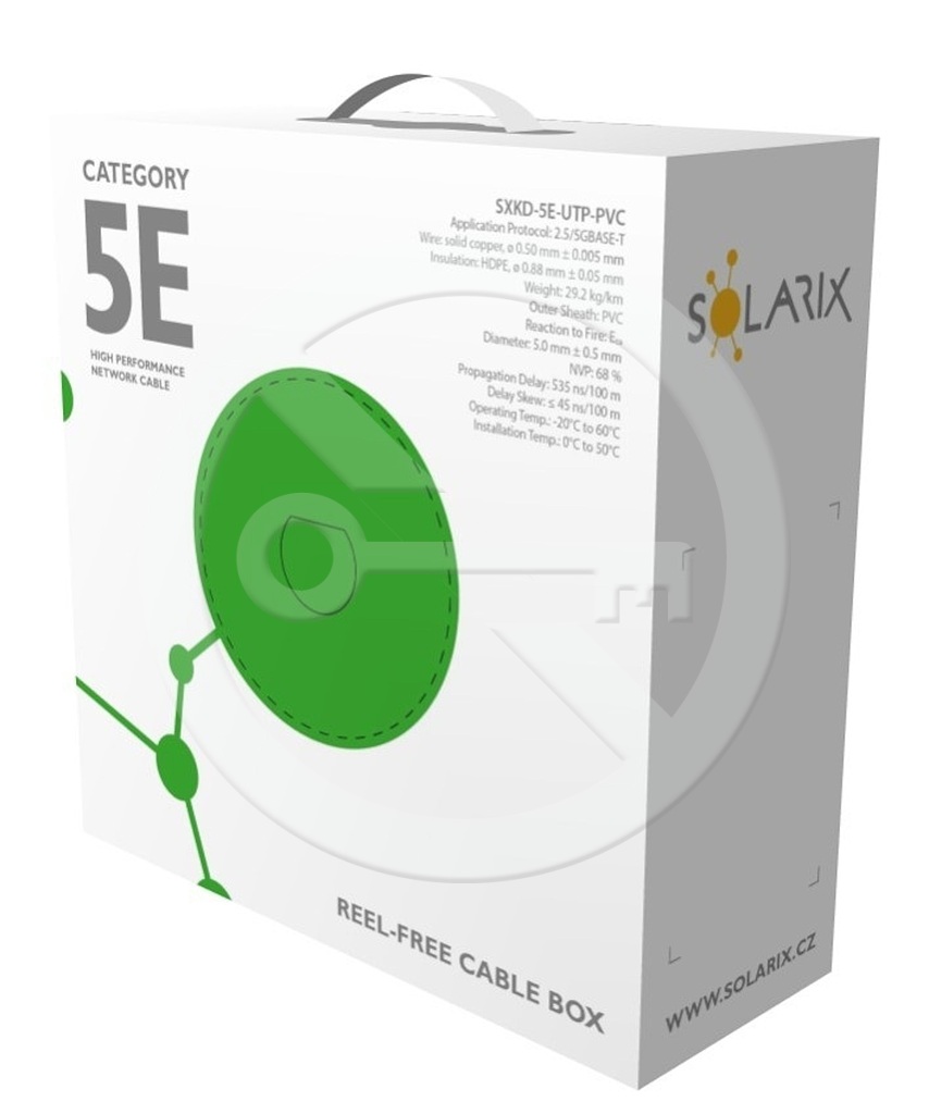 POZOR, nový 100 metrový box. Instalační kabel Solarix s označením SXKD-5E-UTP-PVC je spolehlivý nestíněný kabel kategorie 5E, který je určený pro provoz ethernetových protokolů, včetně 2.5GBASE-T a 5GBASE-T*. Konstrukce kabelu je U/UTP, typ pláště PVC s třídou reakce na oheň Eca. Vodiče kabelu jsou vyrobeny z kvalitního měděného drátu s čistotou mědi 99,97%. Kabel bez problémů splňuje požadavky z mezinárodních standardů ISO/IEC 11801, EN 50173 a ANSI/TIA 568.2-D. V případě CPR (nařízení EU č. 305/2011) je kabel testován u nezávislé laboratoře FORCE TECHNOLOGY v systému posuzování vlastností AVCP 3. Stejně jako ostatní kabely Solarix, je i kabel SXKD-5E-UTP-PVC značen metráží po 1 m v rozsahu od 0 do 100 m. Kabel je dodáván ve vysoce odolném třívrstvém leštěném kartónovém boxu (vždy barevně odlišeném podle typu kabelu), na kterém jsou uvedeny všechny nezbytné produktové informace, včetně čárových kódů, výrobní šarže, popisu a nejdůležitějších technických parametrů.