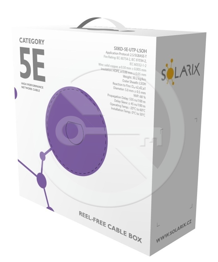 POZOR, nový 100 metrový box. Instalační kabel Solarix s označením SXKD-5E-UTP-LSOH je spolehlivý nestíněný kabel kategorie 5E, který je testován až do šířky pásma 350 MHz, a je určený pro provoz ethernetových protokolů, včetně 2.5GBASE-T a 5GBASE-T*. Konstrukce kabelu je U/UTP, typ pláště LSOH s třídou reakce na oheň Dca-s1,d2,a1. Vodiče kabelu jsou vyrobeny z kvalitního měděného drátu s čistotou mědi 99,97%. Kabel bez problémů splňuje požadavky z mezinárodních standardů ISO/IEC 11801, EN 50173 a ANSI/TIA 568.2-D. Výkonové parametry tohoto kabelu byly otestovány nezávislou testovací zkušebnou FORCE TECHNOLOGY v rámci programu EC Verified, a to na nejvyšší úroveň tzv. Component Level. Certifikát je k dispozici zde na webu v záložce "Soubory ke stažení" nebo přímo na stránkách laboratoře FORCE. V případě CPR (nařízení EU č. 305/2011) je kabel testován v systému posuzování vlastností AVCP 3. Stejně jako ostatní kabely Solarix, je i kabel SXKD-5E-UTP-LSOH značen metráží po 1 m v rozsahu od 0 do 100 m. Kabel je dodáván ve vysoce odolném třívrstvém leštěném kartónovém boxu (vždy barevně odlišeném podle typu kabelu), na kterém jsou uvedeny všechny nezbytné produktové informace, včetně čárových kódů, výrobní šarže, popisu a nejdůležitějších technických parametrů.
