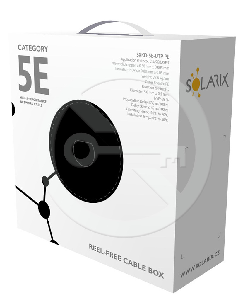 Instalační kabel Solarix s označením SXKD-5E-UTP-PE je spolehlivý venkovní nestíněný kabel kategorie 5E, který je určený pro provoz ethernetových protokolů, včetně 2.5GBASE-T a 5GBASE-T*. Konstrukce kabelu je U/UTP, typ pláště UV stabilní PE s třídou reakce na oheň Fca a stupněm krytí IP67. Vodiče kabelu jsou vyrobeny z kvalitního měděného drátu s čistotou mědi 99,97%. Kabel bez problémů splňuje požadavky z mezinárodních standardů ISO/IEC 11801, EN 50173 a ANSI/TIA 568.2-D. Stejně jako ostatní kabely Solarix, je i kabel SXKD-5E-UTP-PE značen metráží po 1 m v rozsahu od 0 do 100 m. Kabel je dodáván ve vysoce odolném třívrstvém leštěném kartónovém boxu (vždy barevně odlišeném podle typu kabelu), na kterém jsou uvedeny všechny nezbytné produktové informace, včetně čárových kódů, výrobní šarže, popisu a nejdůležitějších technických parametrů. Tento kabel není určen pro trvalé uložení do vody ani do země bez odpovídající řádné ochrany..