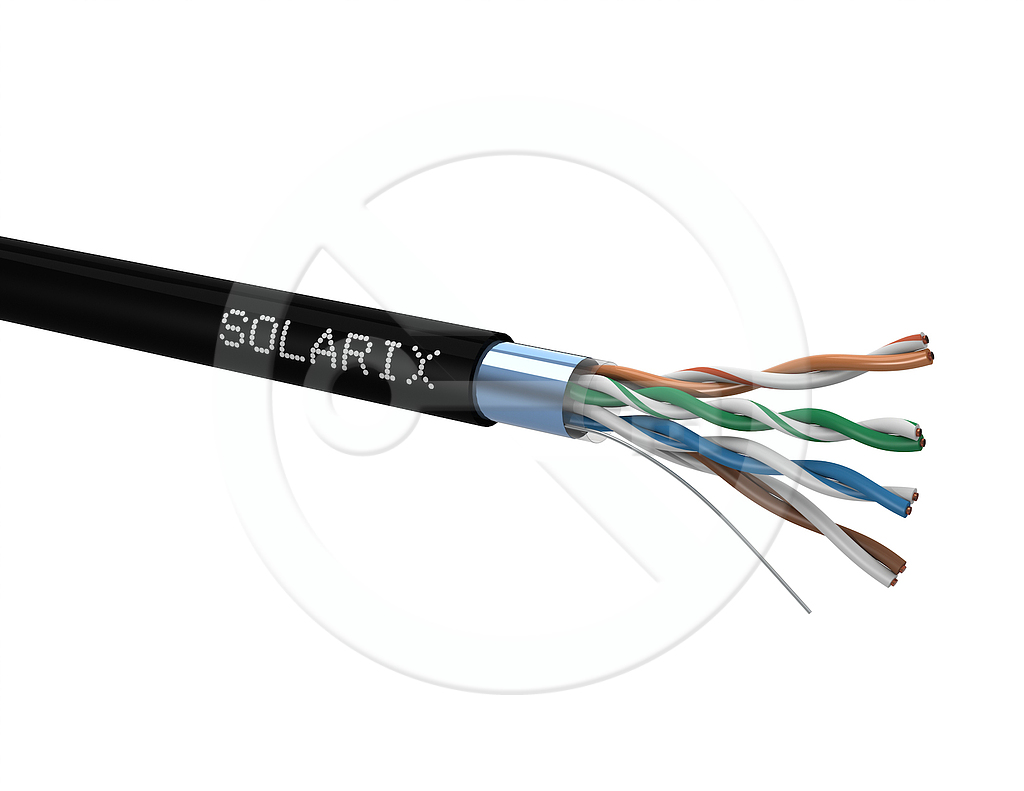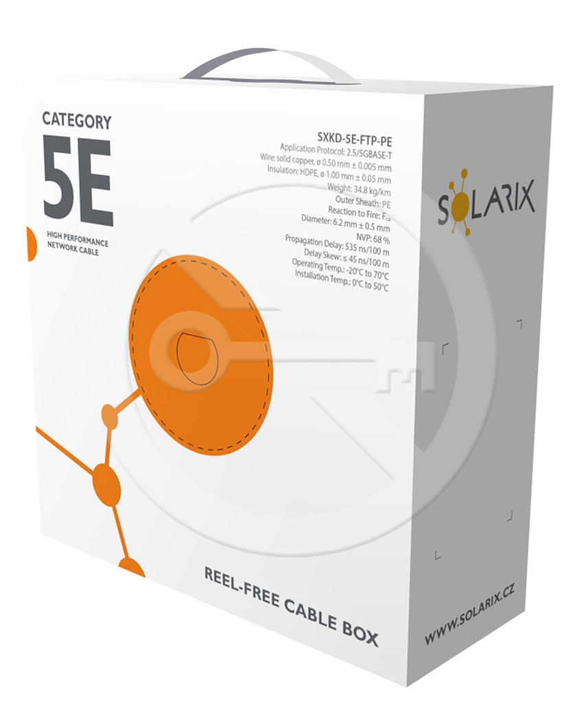 Instalační kabel Solarix s označením SXKD-5E-FTP-PE je spolehlivý venkovní stíněný kabel kategorie 5E, který je určený pro provoz ethernetových protokolů, včetně 2.5GBASE-T a 5GBASE-T*. Konstrukce kabelu je F/UTP, typ pláště UV stabilní PE s třídou reakce na oheň Fca a stupněm krytí IP67. Vodiče kabelu jsou vyrobeny z kvalitního měděného drátu s čistotou mědi 99,97%. Kabel bez problémů splňuje požadavky z mezinárodních standardů ISO/IEC 11801, EN 50173 a ANSI/TIA 568.2-D. Stejně jako ostatní kabely Solarix, je i kabel SXKD-5E-FTP-PE značen metráží po 1 m v rozsahu od 0 do 100 m. Kabel je dodáván ve vysoce odolném třívrstvém leštěném kartónovém boxu (vždy barevně odlišeném podle typu kabelu), na kterém jsou uvedeny všechny nezbytné produktové informace, včetně čárových kódů, výrobní šarže, popisu a nejdůležitějších technických parametrů. Tento kabel není určen pro trvalé uložení do vody ani do země bez odpovídající řádné ochrany.