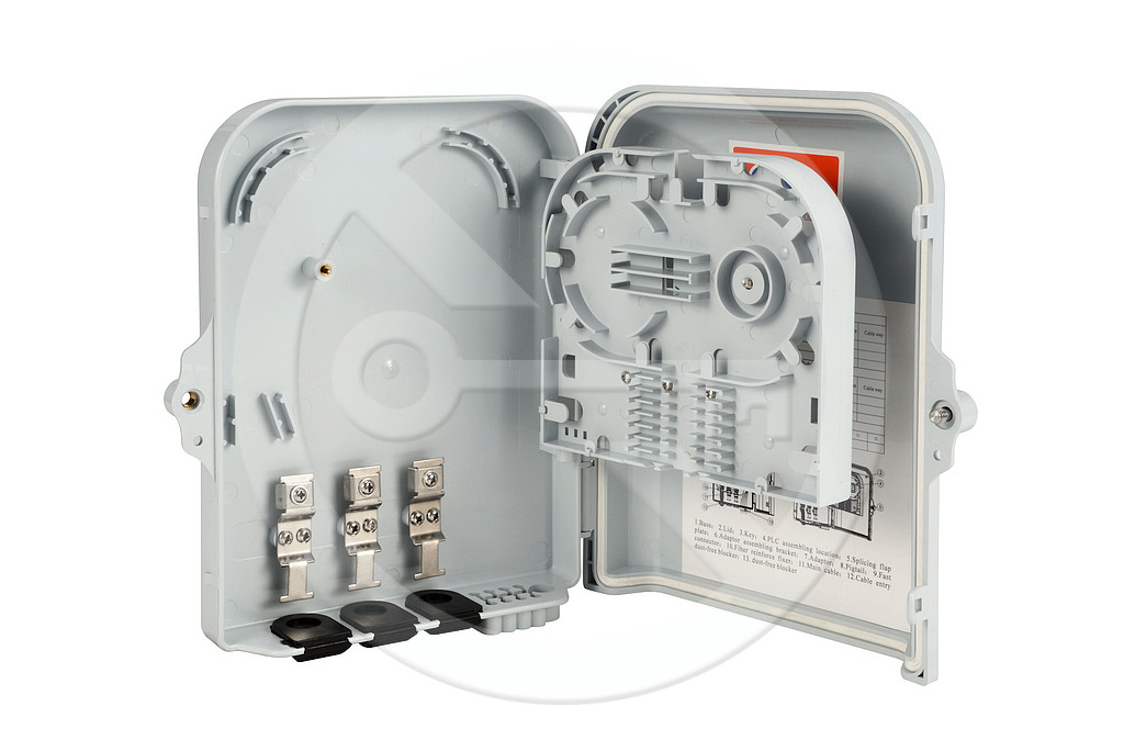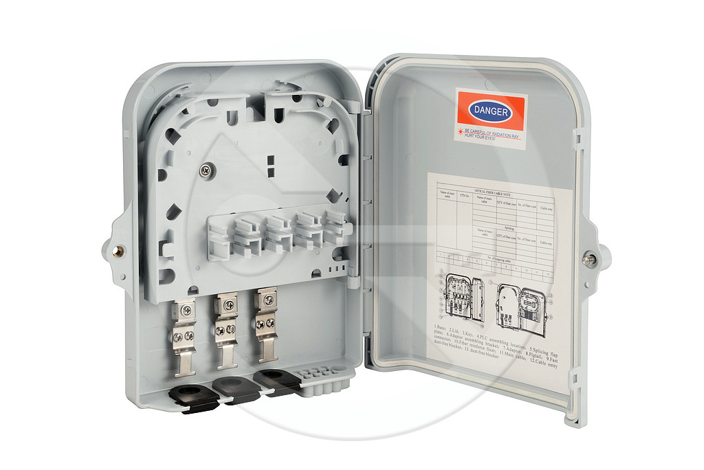 Optický nástěnný box slouží k ukončení optických kabelů ve venkovních i vnitřních instalací. Tento optický box se vyznačuje vysokým stupněm krytí IP65. Povrch optického nástěnného boxu je UV odolný. Je možno jej upevnit na sloup nebo za pomocí montážní sady přímo na zeď. Optický box umožňuje ukončit až 8 vláken v kombinaci adaptérů 8xSC simplex nebo 8xLC duplex, popřípadě 8xE2000. Obsahuje 3x vstup pro optické kabely s gumovou krytkou v provedení mid-span tzn., že je možné ukončit i průběžně instalovaný kabel bez nutnosti přerušení všech vláken v kabelovém svazku. Výstup disponuje 8 otvory pro patch kabely, které jsou opatřeny gumovou krytkou plus pomocný otvor na vsunutí/vysunutí optického konektoru patch kabelu. Při umístění patch kabelu dojde k odstranění gumové krytky a místo ní se použije plastová objímka, která utěsní prostor mezi pláštěm patch kabelu a výstupním otvorem boxu. Součástí optického boxu je i vertikální vyklápěcí dno, zajišťující snadnější manipulaci při ukončení a vyvázání pigtailů. Samotný box je uzamykatelný.