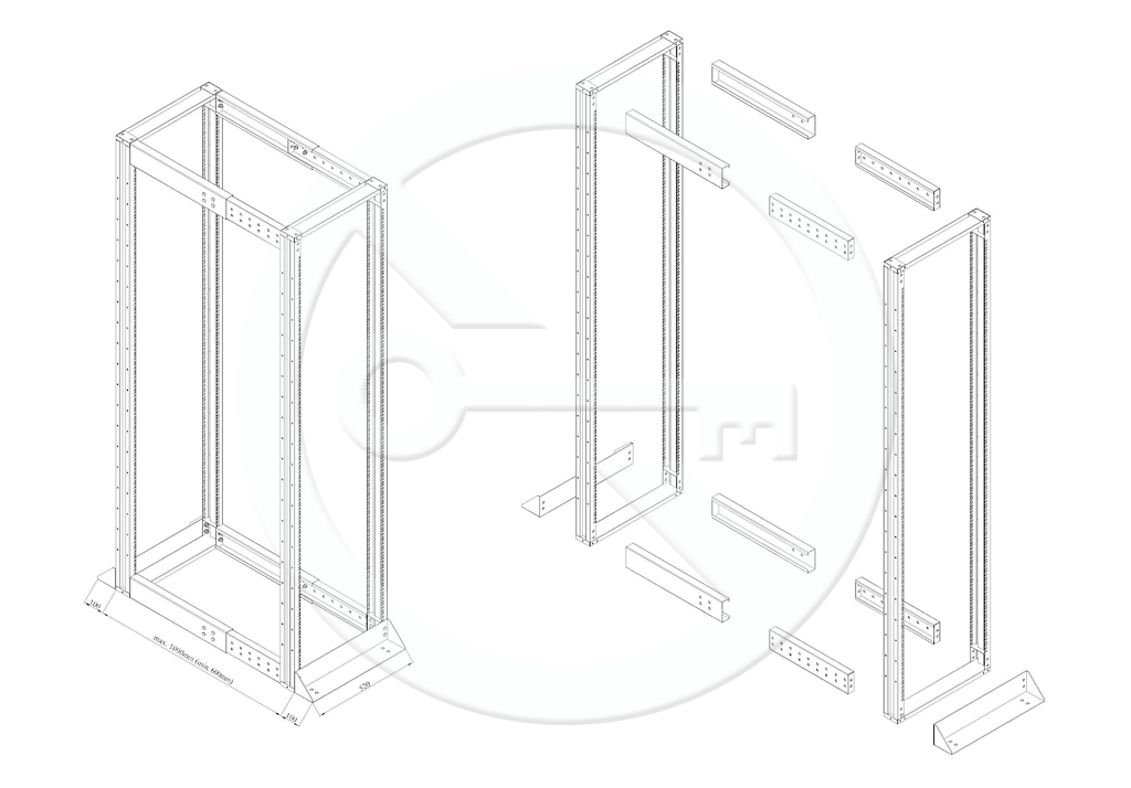 Základním prvkem vysokonosného rámu je svařená 19“ konstrukce s posuvnými lištami v rozsahu 600 až 1 000 mm a nosností 1 200 kg.