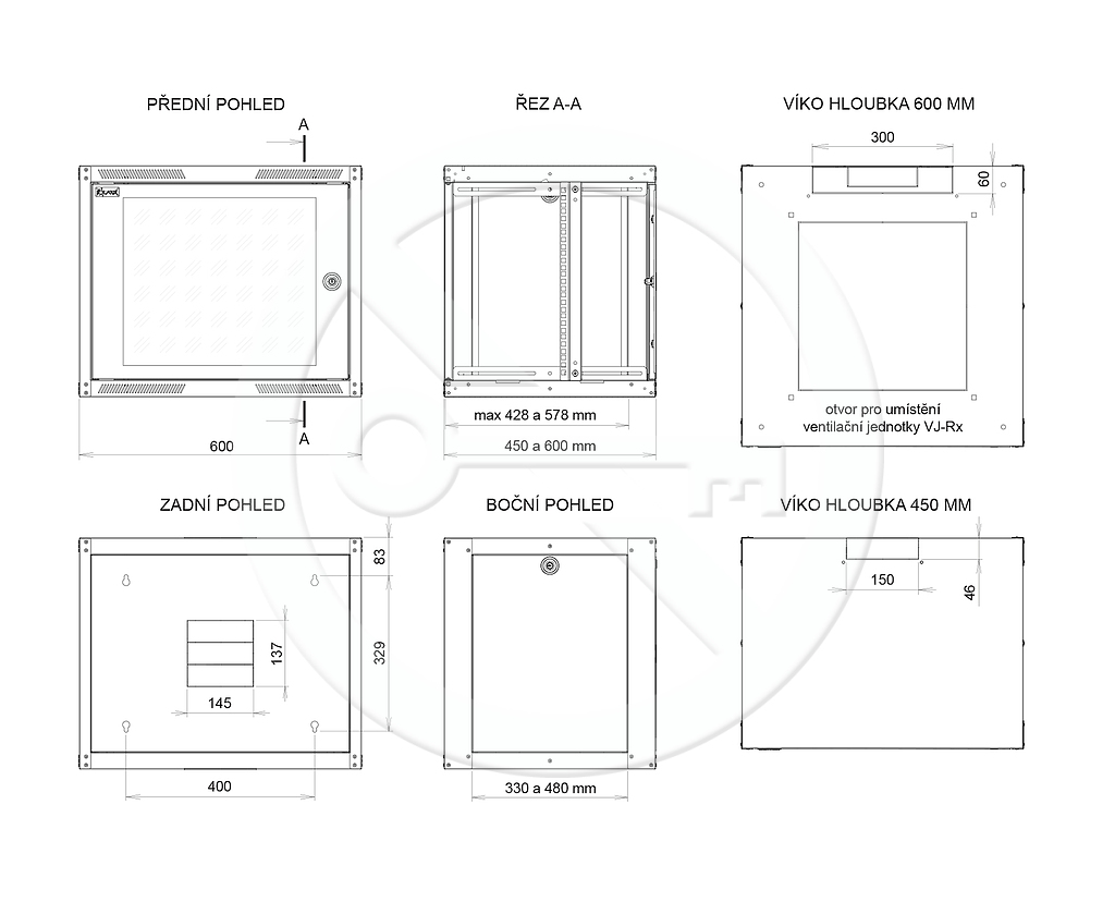 U rozvaděčů s hloubkou 600 mm je možné využít připravené vylamovací otvory ve víku a dně pro montáž naší standardní ventilační jednotky označované jako VJ-Rx s 2 až 6 ventilátory. Dále je u těchto rozvaděčů možné využít předpřipravených otvorů pro montáž koleček, nebo vyrovnávacích nožiček přímo na rozvaděči.
