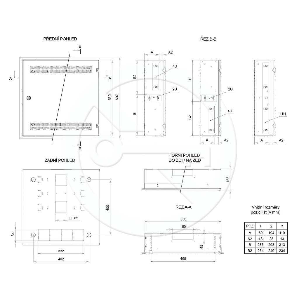Vstup kabelů je možný předpřipravenými otvory v zádech i ve všech stěnách rozvaděče. V zadní části rozvaděče jsou připraveny otvory pro uchycení na zeď.