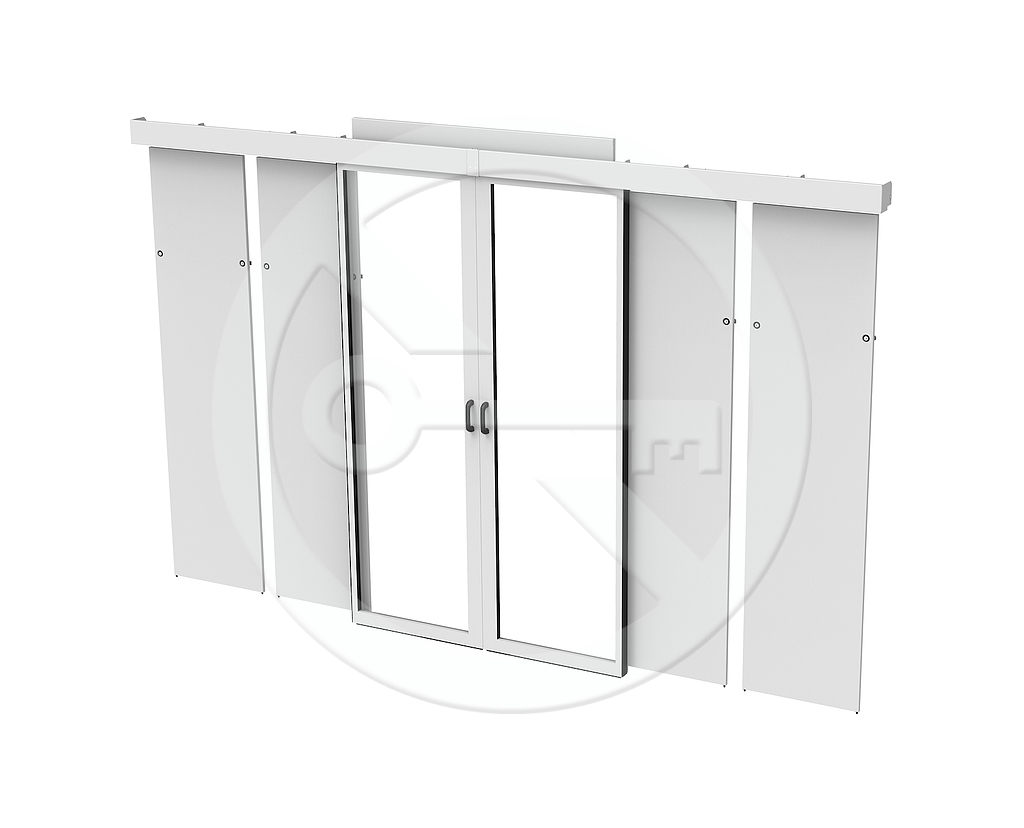 Dvě křídla posuvných dveří včetně kolejnicové a posuvné jednotky a samozavíracího mechanismu.