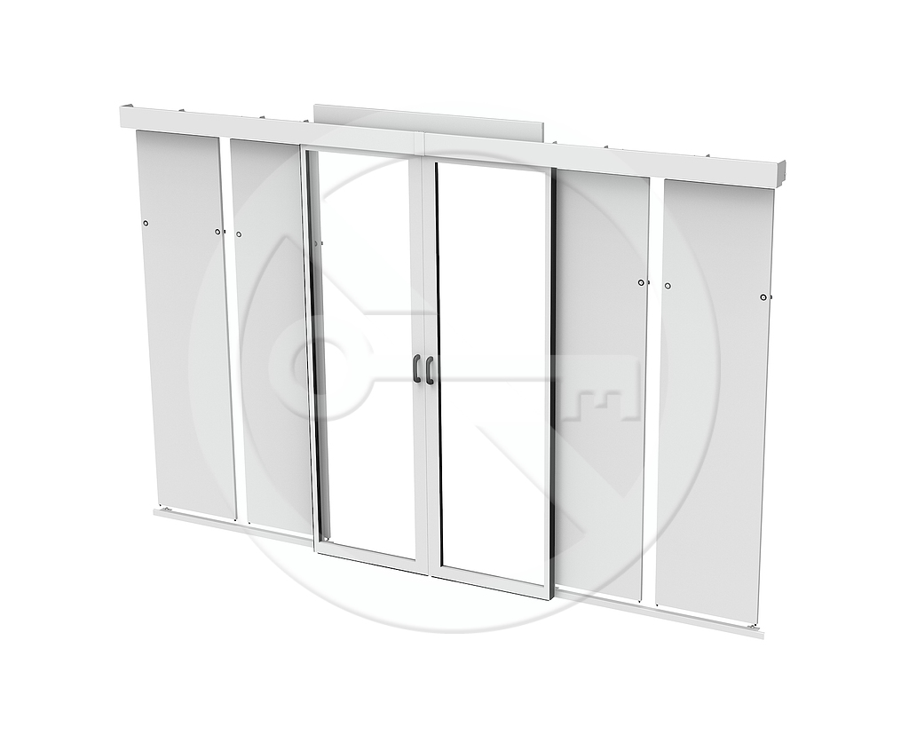 Dvě křídla posuvných dveří včetně kolejnicové a posuvné jednotky a samozavíracího mechanismu.