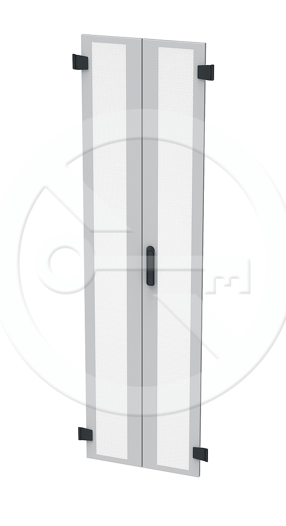 Dveře plechové s perforací dvoukřídlé pro rozvaděč LC-50, provedení v barvě světle šedá RAL 7035, tříbodové zamykání, výklopná klika.