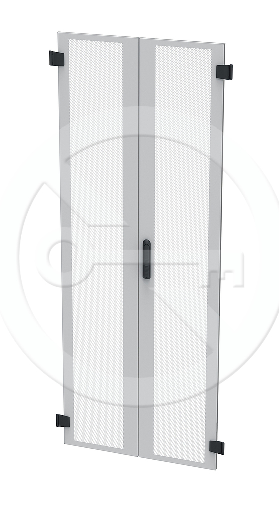 Dveře plechové s perforací dvoukřídlé pro rozvaděč LC-50, provedení v barvě světle šedá RAL 7035, tříbodové zamykání, výklopná klika.