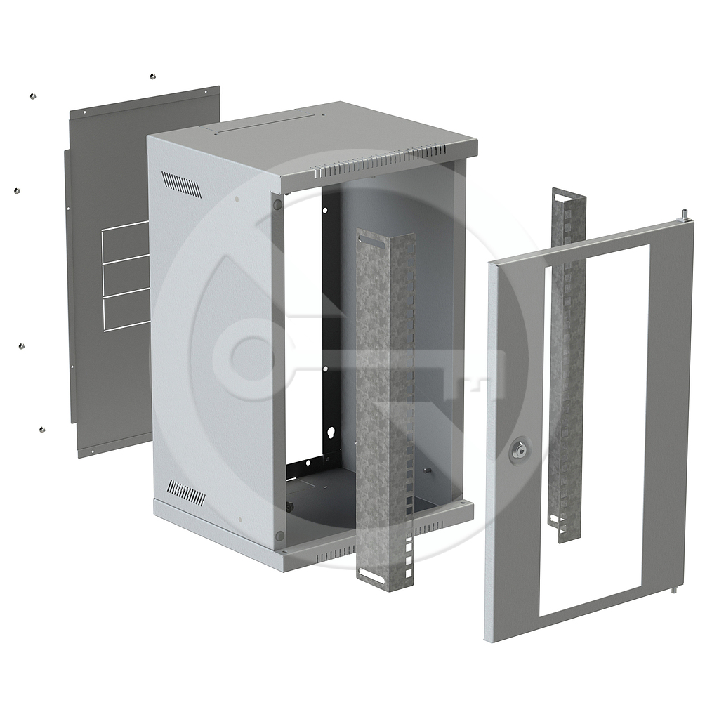 10" nástěnné rozvaděče jsou určeny pro instalaci prvků strukturované kabeláže malého rozsahu. Do standardní výbavy tohoto typu rozvaděče patří přední 10“ vertikální lišty, skleněné dveře se zámkem, perforovaný skelet pro lepší odvětrávání a kabelové prostupy ve spodní, horní i zadní části. Rozvaděč je symetrický a jednoduchým otočením lze dosáhnout pravého, nebo levého otevírání dveří. Dveře je pak možné dodat v provedení celoplechovém, nebo perforovaném. Standartní barevné provedení rozvaděče je šedá RAL 7035.